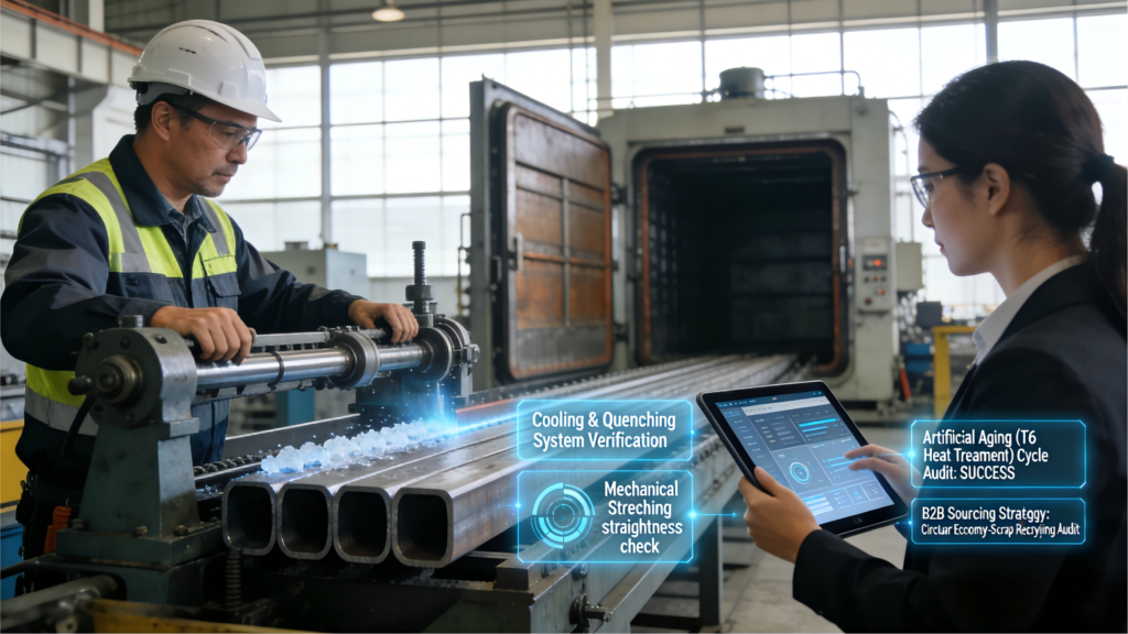 Executing a flawless structural component requires rigorous post-extrusion processing. The metal exits the press in a dangerously hot and highly malleable state. We must manipulate the internal crystalline structure to lock in mechanical strength. We engineer these specific cooling and stretching phases to guarantee absolute geometric stability. We eliminate internal metallurgical stresses across your entire component inventory.