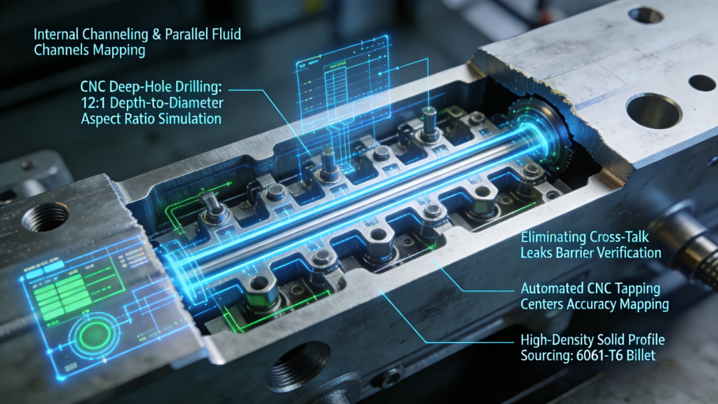CNC machines bore deep internal galleries directly inside the solid metal billet. Engineers drill primary supply and exhaust channels perfectly parallel to each other. Standard drill bits wander and snap when machining deep holes in solid metal. We utilize specialized high-speed gun-drilling techniques instead. High-pressure coolant blasts directly through the center of the spinning drill bit. This fluid pressure evacuates sharp metal chips backward out of the hole perfectly. The resulting internal channel features incredibly smooth, mirror-like metal walls. Smooth internal walls eliminate fluid turbulence and aerodynamic pressure drops entirely.
